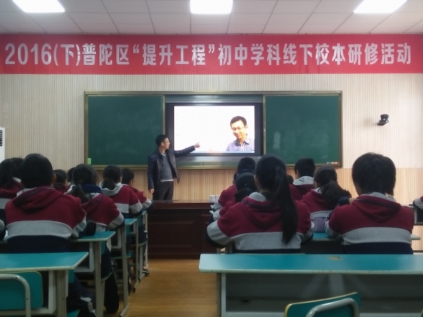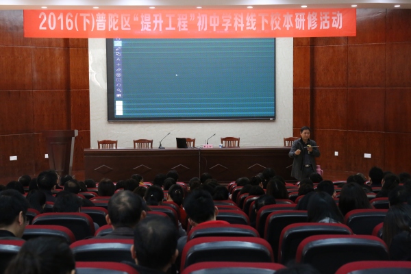 2016年12月8日,普陀区“提升工程”初中学科线下校本研修活动在东港中学召开,浙江师范大学黄立新教授、鲍晓芬老师和海宁县科学骨干周强老师等到校送教,我区各初中学校学科代表和东港中学全体教师100多人参加。本次活动以“信息技术在初中课堂教学的应用创新”为主题。上午,东港中学的周凯老师和海宁长安初级中学的周强老师分别执教了两堂科学课,黄立新教授对两堂课进行了点评。其中,周凯老师执教的《身体的防卫》,能熟练运用“学乐云”教学平台,采用“小组拍摄照片实时同频”、“习题导出”、“微视频”、“微课”等方式,实现生成性资源的建设,从媒体运用的时机、媒体运用的方式、媒体创设的环节等方面都体现了媒体运用的丰富性和技术运用的恰当性,充分体现了信息技术在初中科学课堂中的创新应用,深受专家好评。下午,浙师大黄立新教授进行了“信息技术在初中课堂教学中的应用创新”专题讲座。黄教授从教学实际出发,分别推荐了适合初中各学科可以用于教学、提升教学效果的小软件。特别是讲解的ExplainEverything等软件在教学中的实际操作演示,内容详实、深入浅出,引起了参训教师们的极大兴趣,感触良多:信息技术进步如此之迅猛,力量如此之强大,将信息技术融入到教育教学中,原来可以让我们的课堂变得如此精彩纷呈!